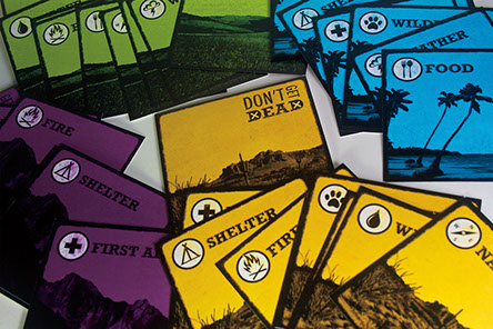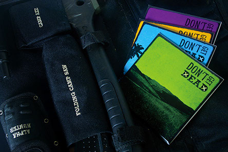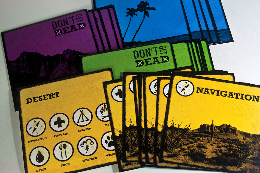 Summary: The Don’t Get Dead series is a quick reference guide for outdoor survival techniques and useful camping skills. The series is comprised of four lightweight card decks broken down by region (Mountain, Valley, Coast and Desert). In each are useful tips for the various needs of outdoor survival: Food, Water, Shelter, etc.