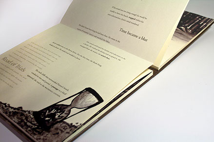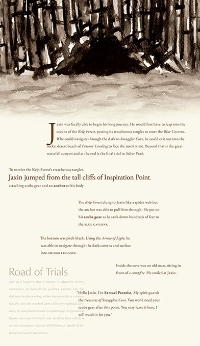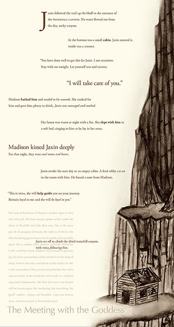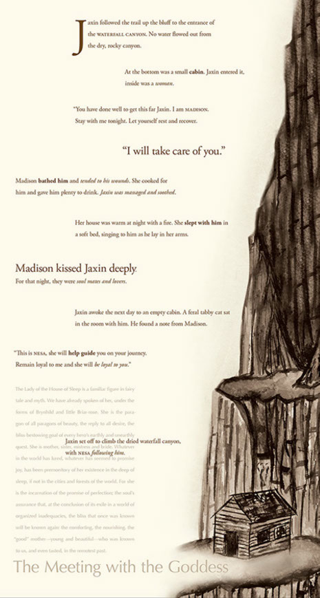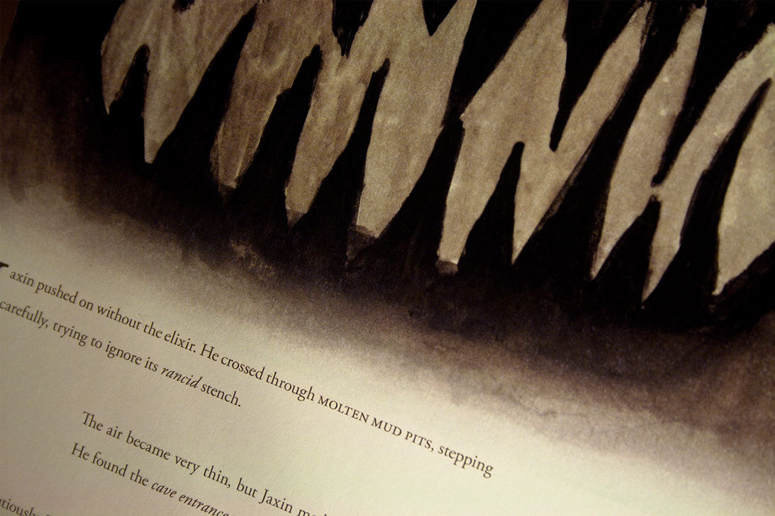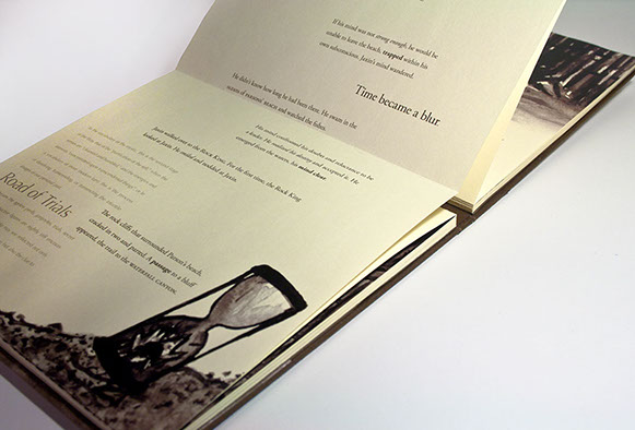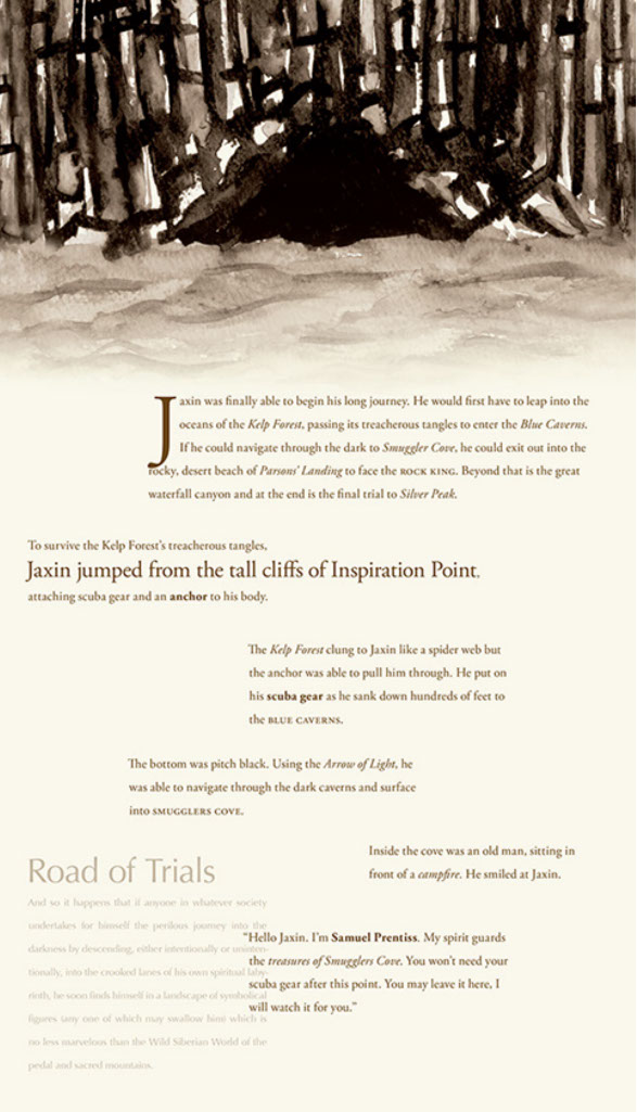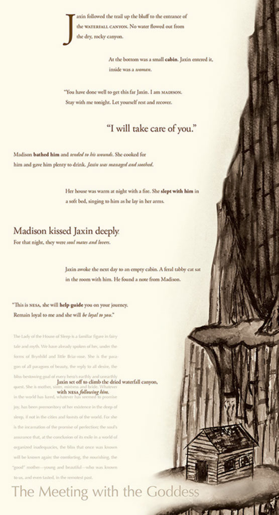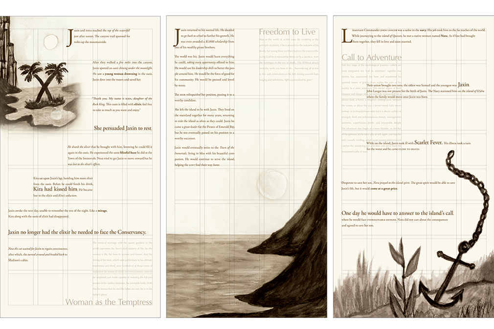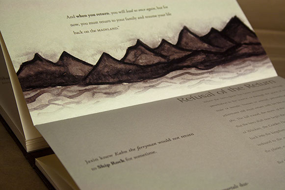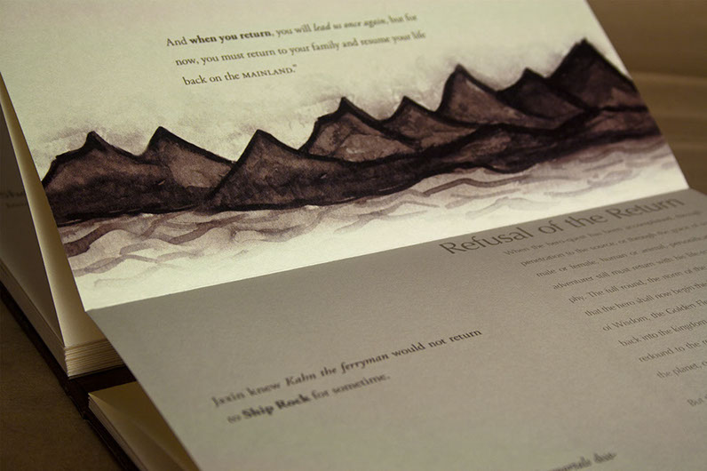 Summary: This project focuses on creating a narrative for a multi-page/multi-surface document that conveys an interaction between two texts; an original fantasy myth as the main focus and The Hero’s Journey by Joseph Campbell to parallel. The book is designed to look ancient, accompanied by ink wash illustrations and rendered in a vertical format to simulate the continuity of a hand scroll.