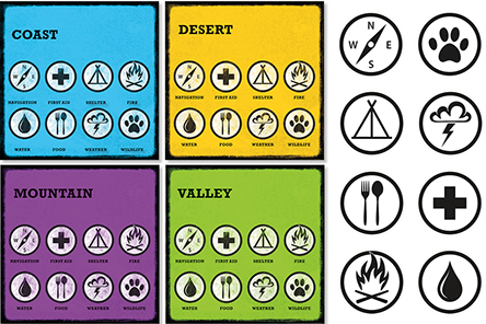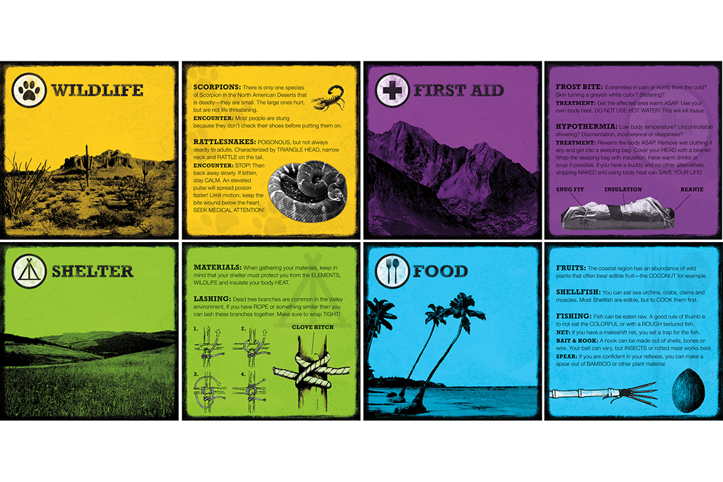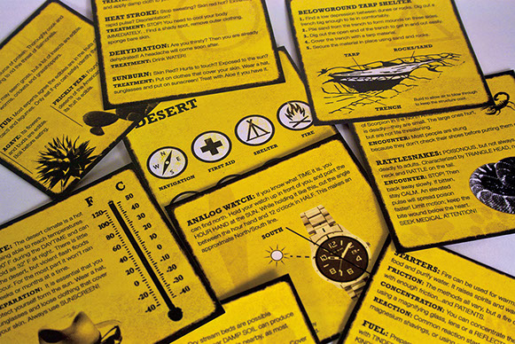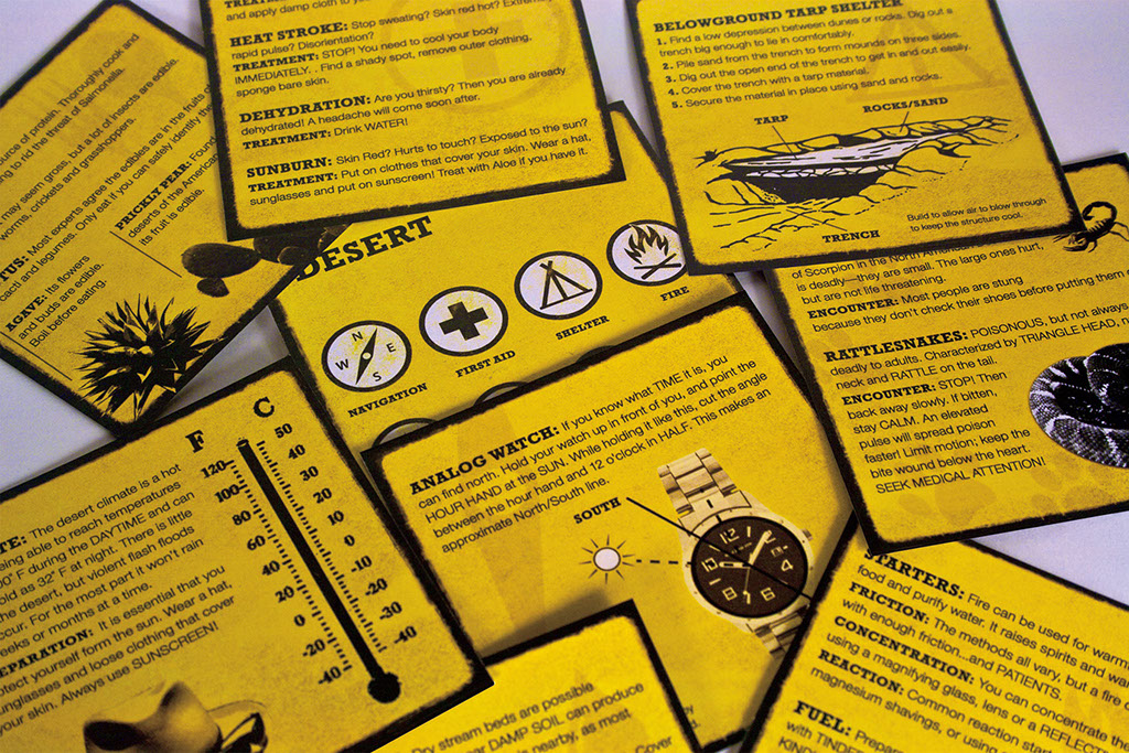 Summary: The Don’t Get Dead series is a quick reference guide for outdoor survival techniques and useful camping skills. The series is comprised of four lightweight card decks broken down by region (Mountain, Valley, Coast and Desert). In each are useful tips for the various needs of outdoor survival: Food, Water, Shelter, etc.
